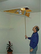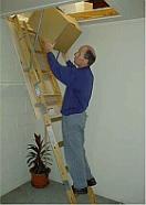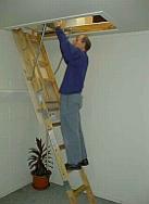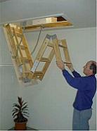 | Folding Attic Stairs, also known as folding ladders, are a convenient and easy way to turn your unused attic space into a useful space. You have lots of storage space in your attic, but you aren't using it because you hate to drag out a ladder and squeeze through your access panel every time you want to put something up or take something out. If you're like most homeowners, you probably need that space. Consider your attic(s). It may be hard to get up there now, and there may not be a floor, but we can change that. Folding stairs are intended to provide easy access to an attic. When you need to get into the attic, you pull down the stairs; when you're done with them, they fold back up into the attic. Most houses have attic space above the upper level and many have attic space over the garage. Either place is usually ideal. After having attic stairs installed, many customers simply use the attic as is. Most attics are filled with insulation and many have no lighting. You must be careful to walk only on the support joists, otherwise it is possible to fall through the ceiling below. Lightweight items can easily be put up there on top of the insulation. However, a better way is to have some plywood flooring and a simple pull chain light bulb holder installed. Not only does it help you see what you are doing up there, but the flooring makes it easier to get around and provides you with a sturdy, solid storage platform. There are several different models of attic stairs to choose from. They range from standard duty to heavy duty, depending on your needs. There are also different installation options. Contact me so we may discuss you needs and put that attic space to good use. |